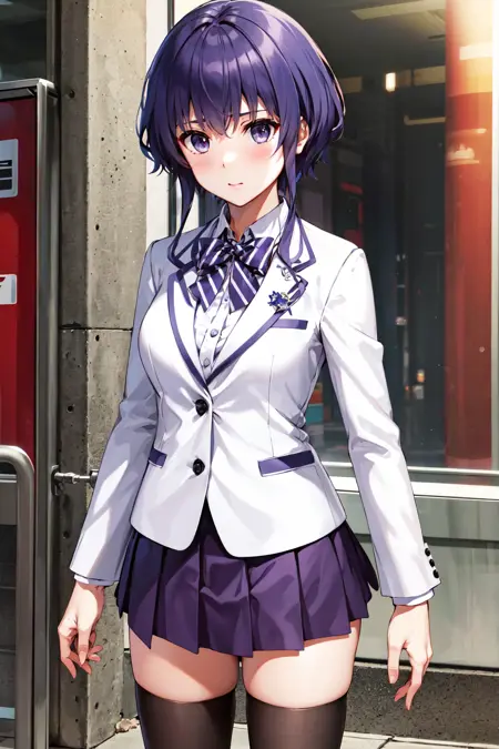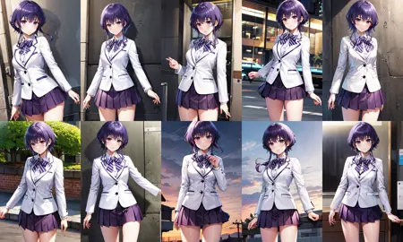 服装1(校服)日向美弦,单人,百褶裙,领结,条纹领结,白色夹克,黑色袜子,紫色裙子,白色西装,条纹领结,长袖