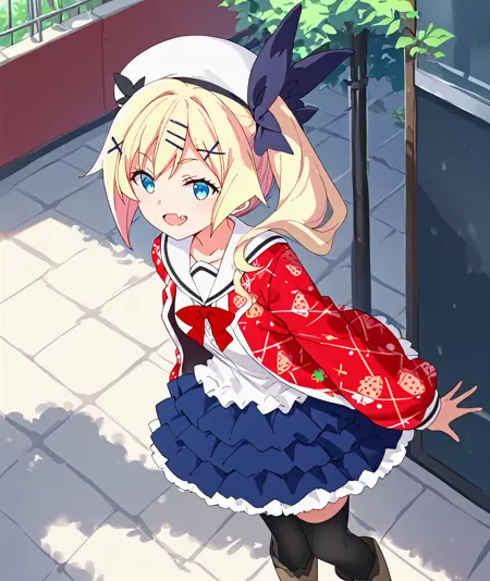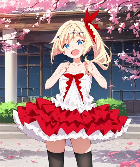 nukui hayu, ochikobore fruit tart, blonde hair, long hair, x hair ornament, blue eyes, hair ribbon, side ponytail,fang,small breasts