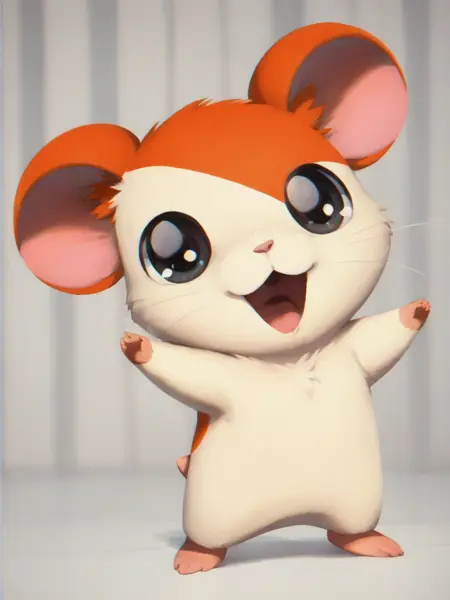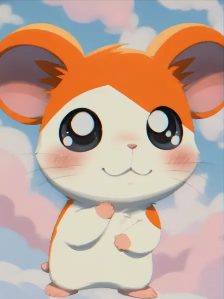 Hamtaro, hamster, boy, Black eyes, fur in the ears, glare in the eyes, Beige body, orange spot on head, orange spot on side, orange ears, pink arms, pink legs, pink tail
