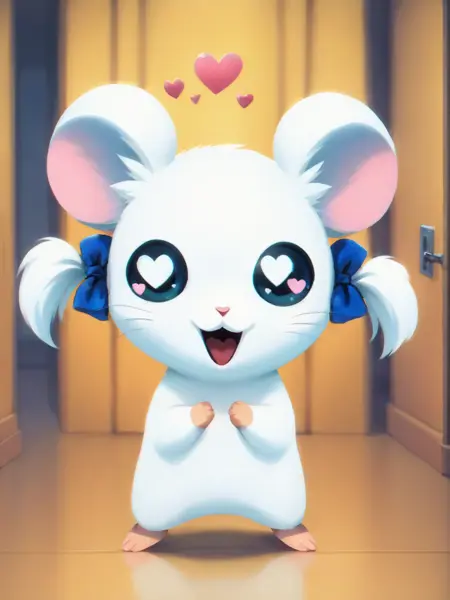 Bijou,仓鼠,女孩,黑色眼睛,耳朵里有毛,粉红色鼻子,白色身体,白色耳朵,粉红色手臂,粉红色腿部,粉红色尾巴,两个发髻,两个蓝色蝴蝶结,眼睛带有绿色高光