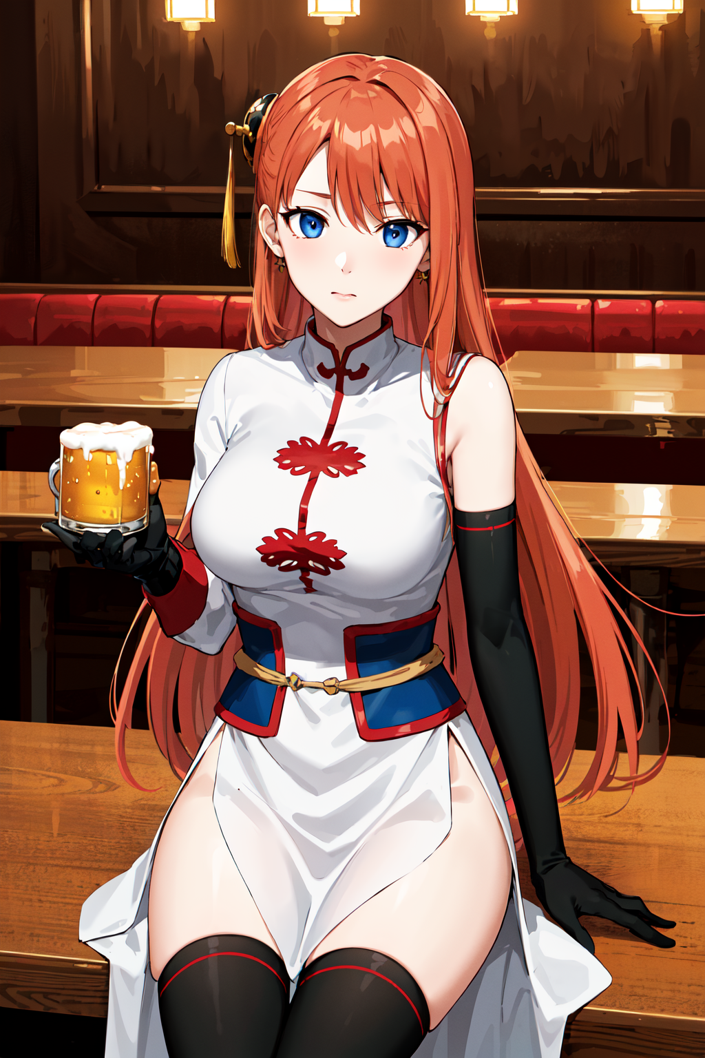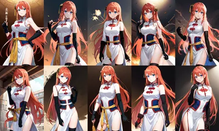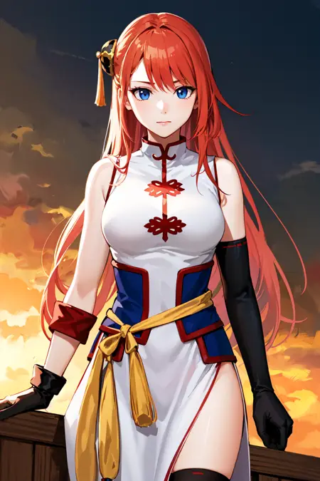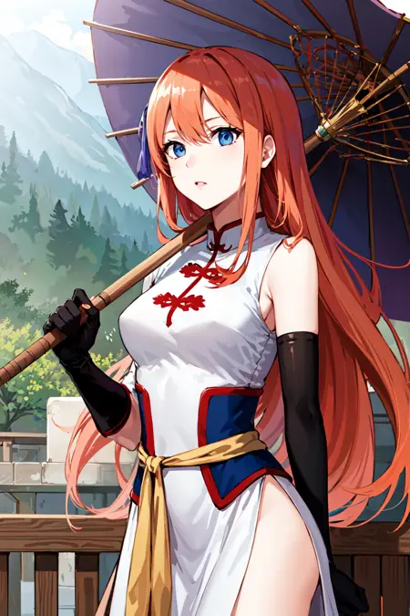 outfit2 (5年後)kgr2, 1girl, 長い髪, 白いドレス, 非対称の手袋, 中国衣装, 側面スリット, 黒い手袋, 中国服, 不均等な手袋, 肘丈手袋, レギンス