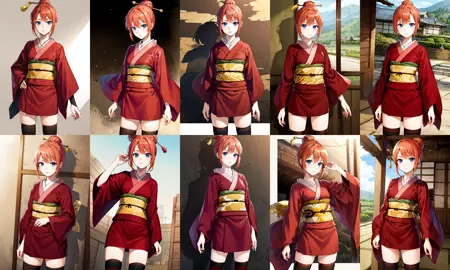 outfit3 (着物)kgr3, レギンス, 和服, 違いレギンス, 赤い着物, 短い着物, 帯, サッシュ, 短い髪