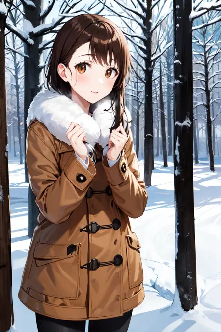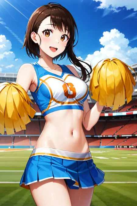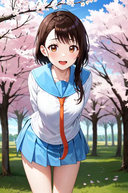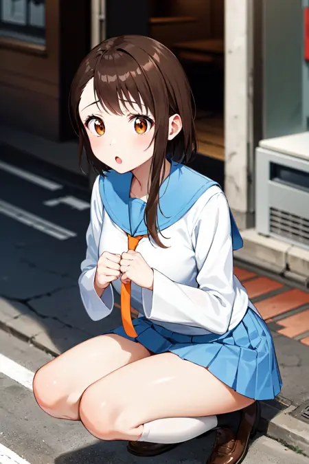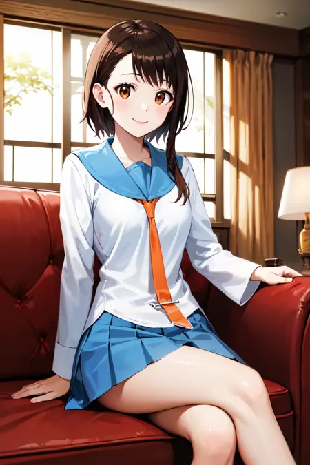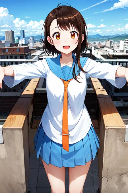 옷차림1aakosaki, 갈색 머리, 측면의 트림, 학교 정장, 파란 수상모자 끈, 오렌지 색 넥타이, 흰색 셔츠, 긴소매, 주름 치마, 파란 치마