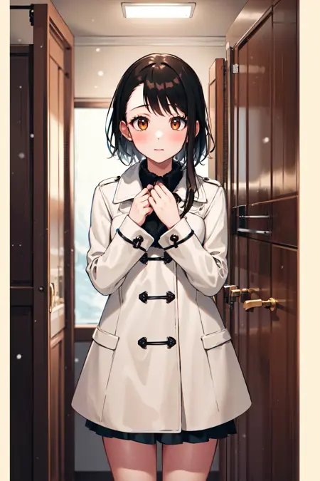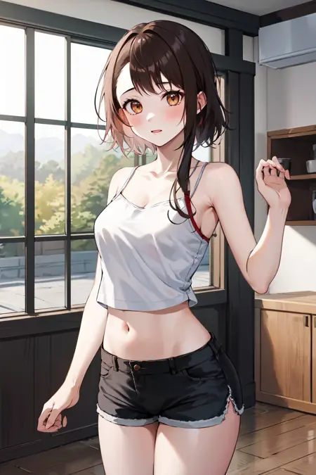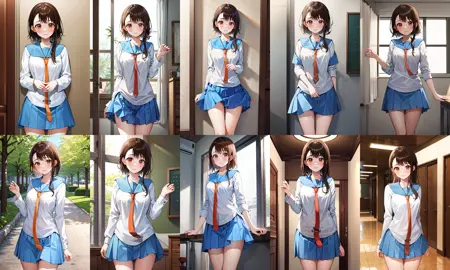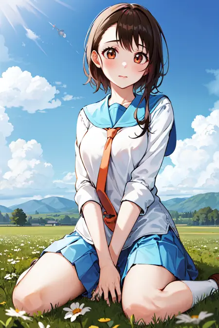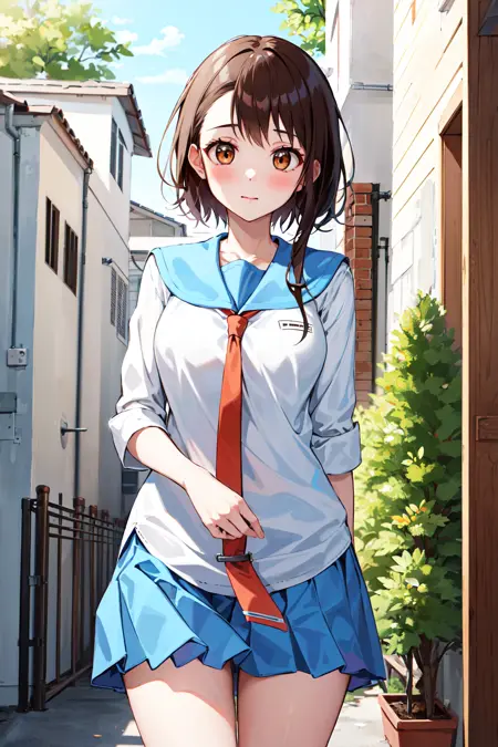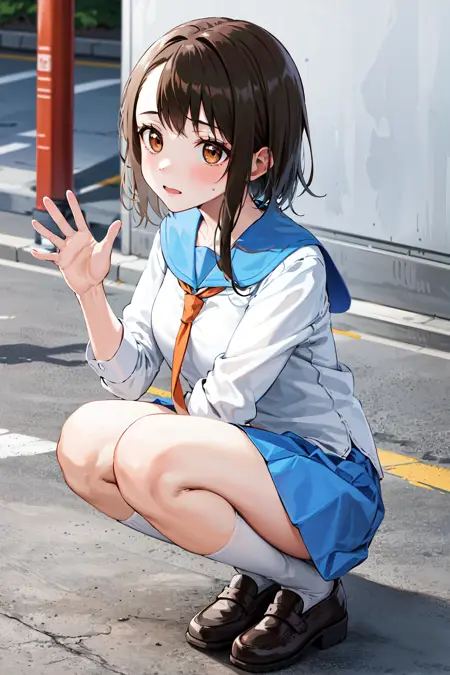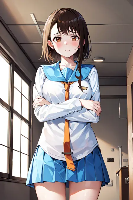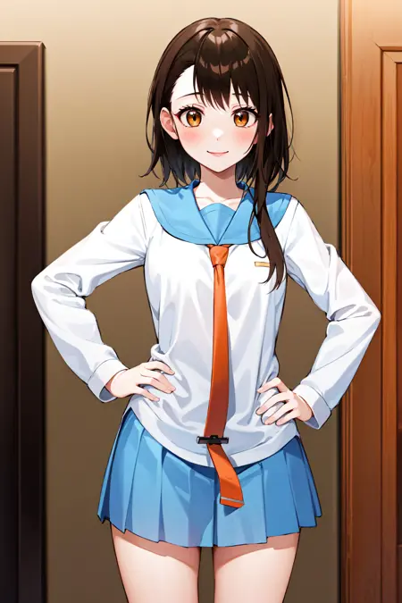 옷차림1aakosaki, 갈색 머리, 측면의 트림, 학교 정장, 파란 수상모자 끈, 오렌지 색 넥타이, 흰색 셔츠, 긴소매, 주름 치마, 파란 치마