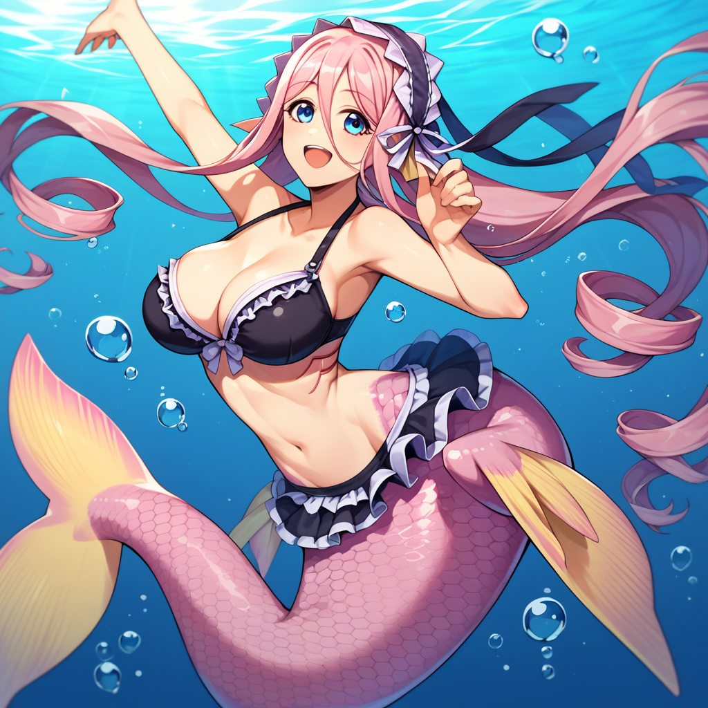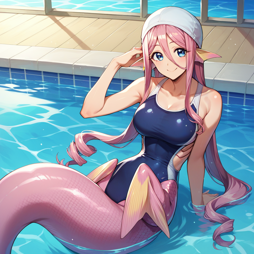 This time I tried a really hard one and as expected, the results are only acceptable. Mermaid tail and her unusual pelvic fins are features that you may not need many repeats to get. Her hands and webs between fingers are surprisingly the feature that really didn't work at all, SD really doens't understand what fingers are. Like happens with all less-humanoid character LoRAs, the generation may tend to ignore some features and place default legs and so, but I think this is the best we can get with the current models.