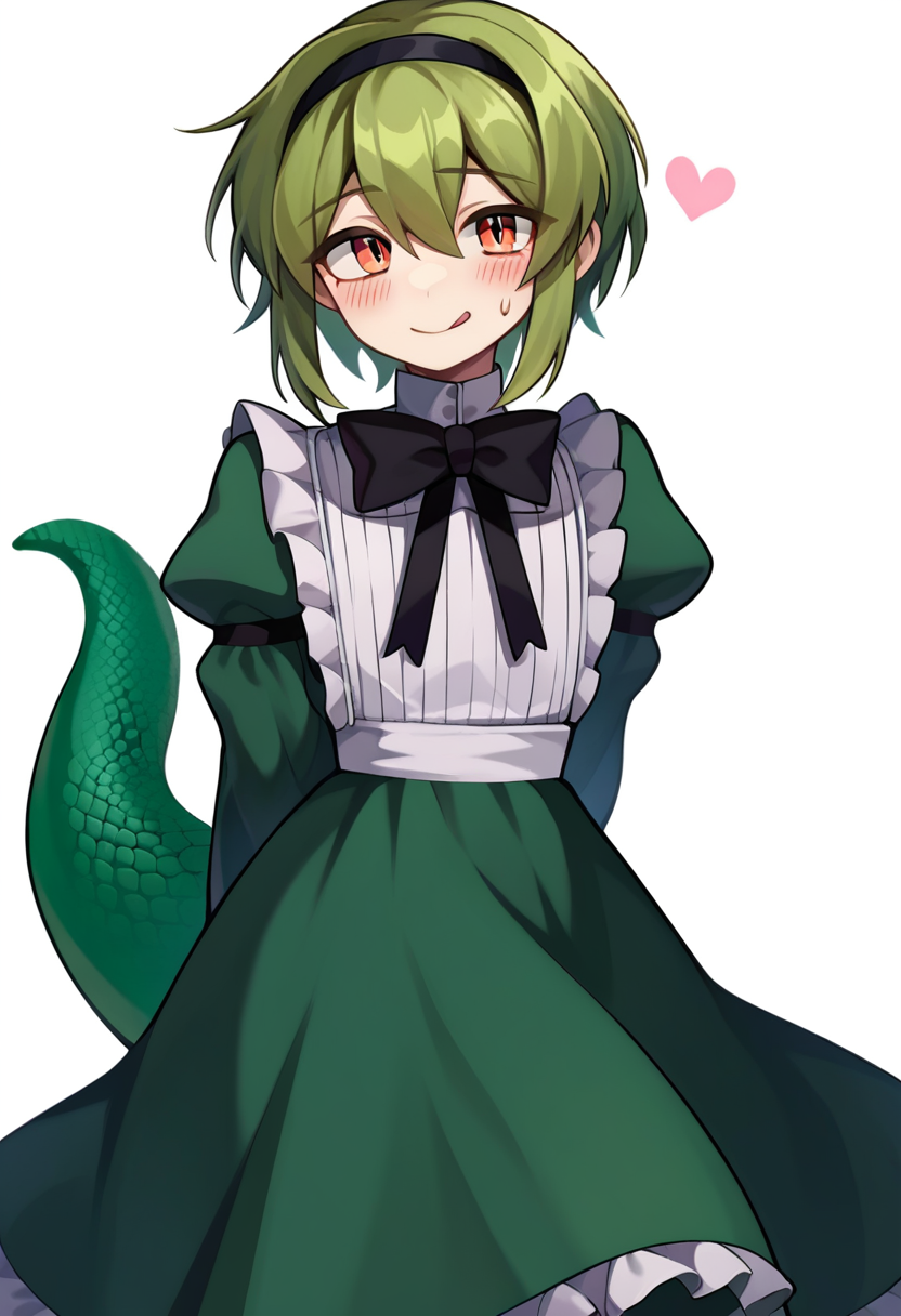 | トレーニングワード | bill2w, solo, green hair, lizard tail, tail, bang, hair between eyes, otoko no ko, 1boy, short hair, orange eyes, コピーしました! juliet sleeves, puffy sleeves, bowtie, black bow, green dress, frills, crossdressing, black hairband, long sleeves, hairband, bow, dress,コピーしました! |