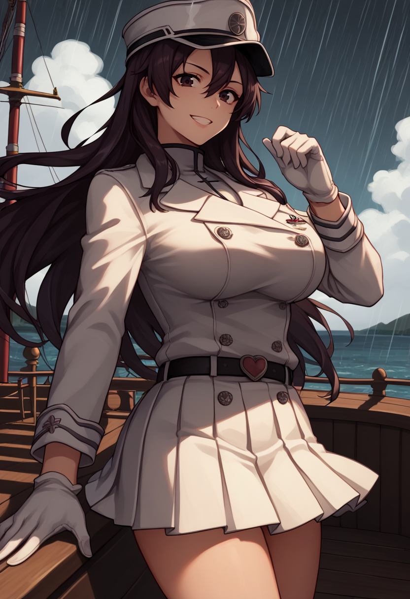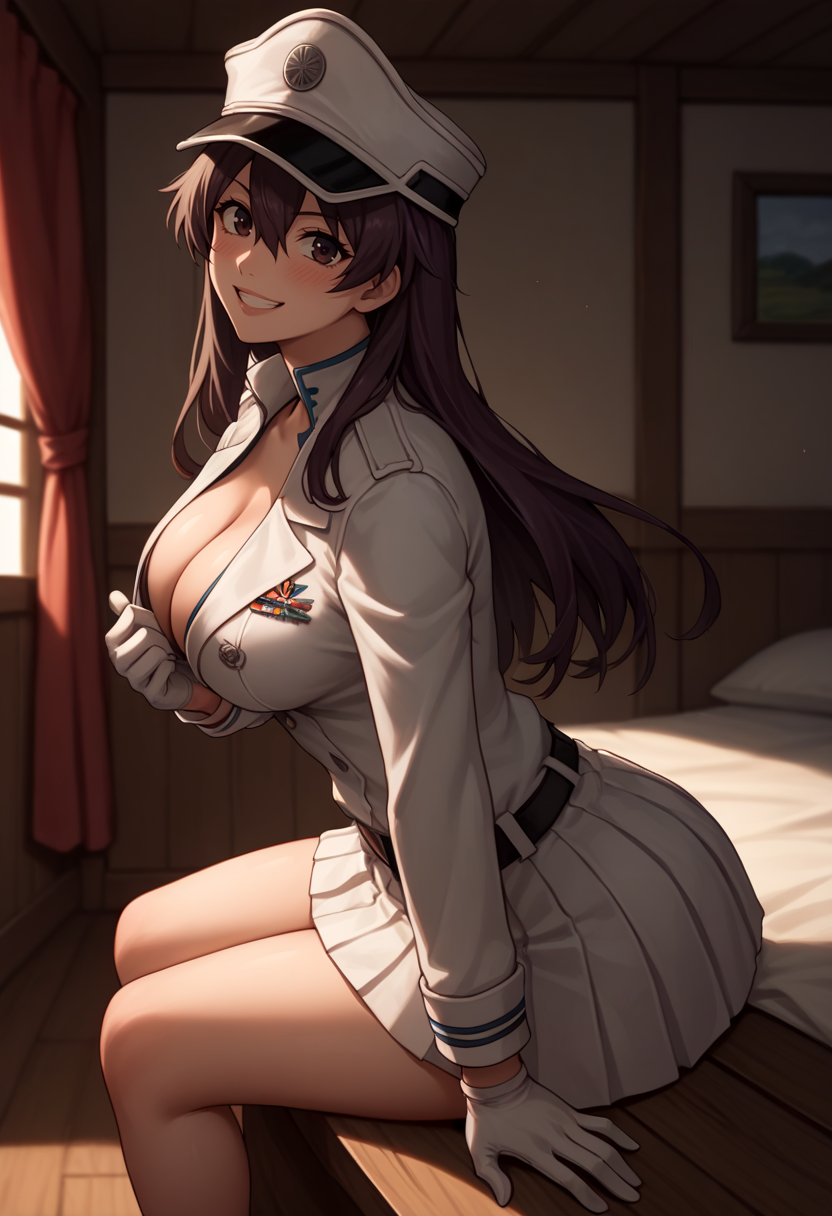 服装: ["basterb, brown hair, long hair, hair between eyes, brown eyes, peaked cap, white gloves, military uniform, white skirt, pleated skirt, double-breasted, white coat, long sleeves, belt"]