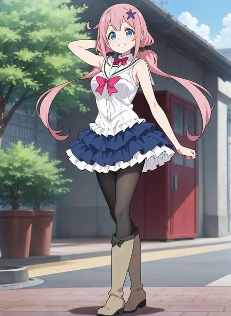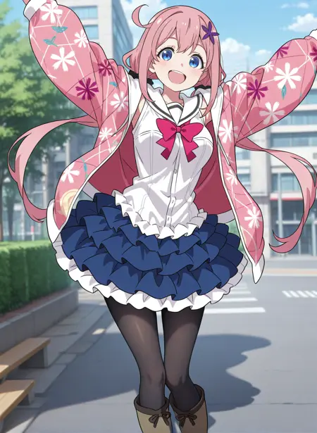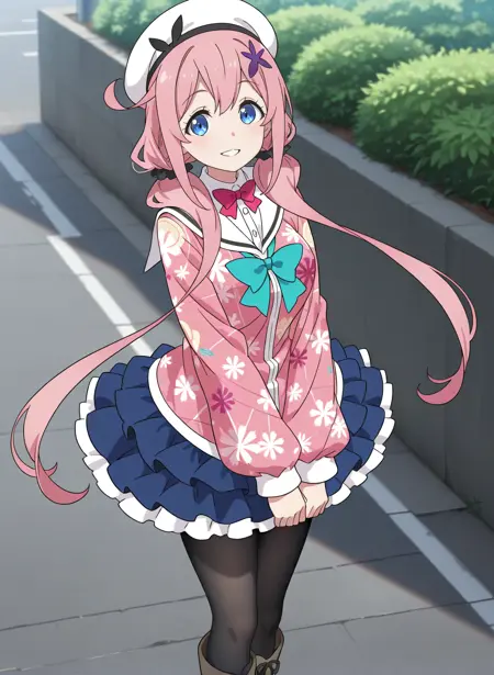 idol_a, 白色帽子, 蓝色裙子, 荷叶边裙子, 分层裙子, 粉色夹克, 长袖夹克, 印花夹克, 花卉图案, 白色水手领, 白色衬衫, 无袖衬衫, 领结, 黑色丝袜, 过膝靴