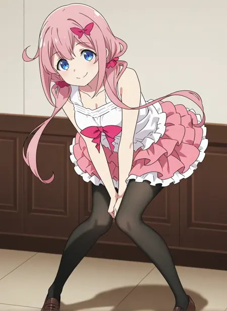 idol_b, 粉色裙子, 荷叶边裙子, 分层裙子, 白色衬衫, 无袖, 连衣裙, 锁骨, 粉色蝴蝶结, 黑色丝袜, 鞋子