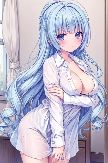 タグ:blue_eyes, blue_hair, wavy_hair, long_hair, blunt_bangs, ponytail, ahoge