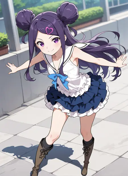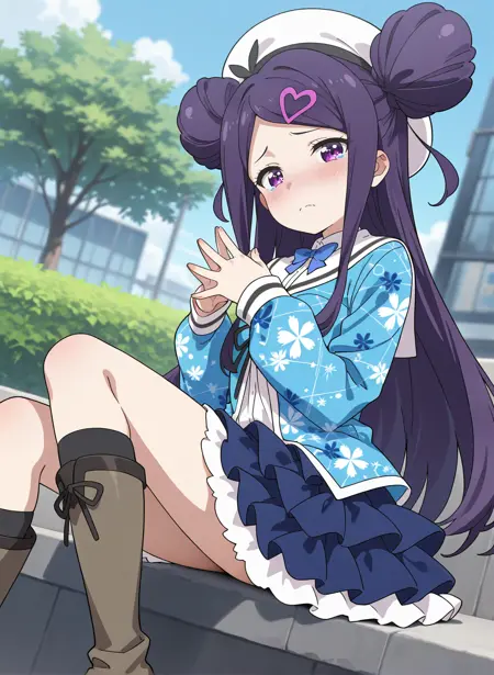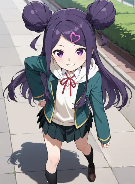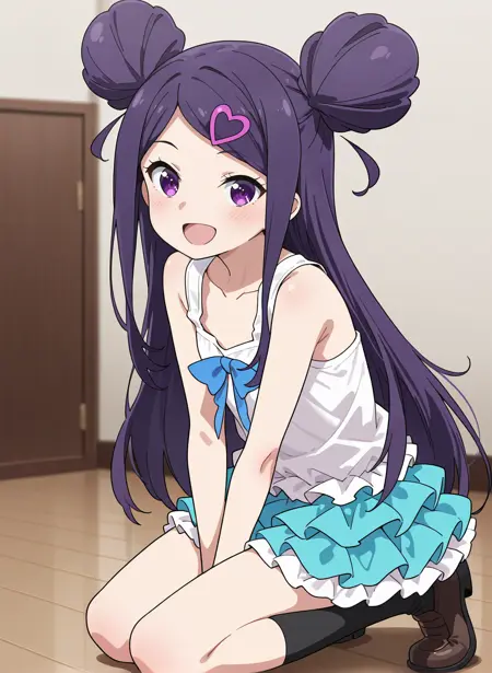 sekino roko, ochikobore fruit tart, 长发, 紫色头发, 双髻, 心形发饰, 紫色眼睛, 平胸