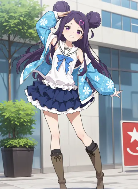 idol_a, 白色帽子, 蓝色裙子, 荷叶边裙子, 层叠裙子, 蓝色夹克, 长袖夹克, 印花夹克, 花卉印花, 白色水手领, 白色衬衫, 无袖衬衫, 蓝色蝴蝶结, 袜子, 过膝靴