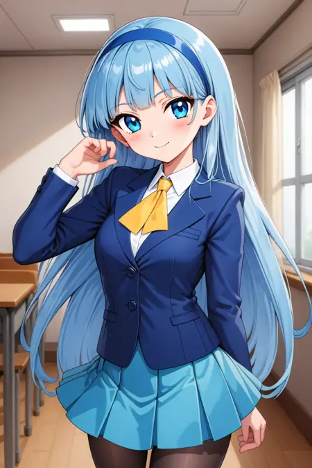 blue hairband,yellow ascot,blue blazer,blue pleated skirt,black pantyhose