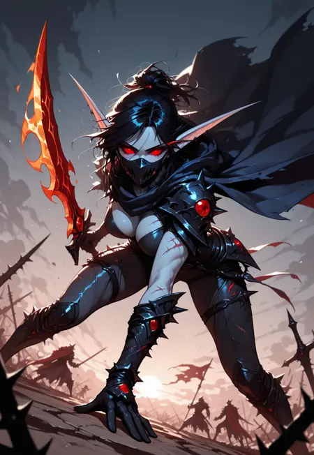 이 스타일은 무엇에 적합할까요? 데스나이트, 언데드, 회색 피부, 머리에서 발끝까지의 흉터와 문신, 철조망, 난폭한 외모, 찢어진 옷, 워크래프트 관련 요소, 피, 잔혹함 등...