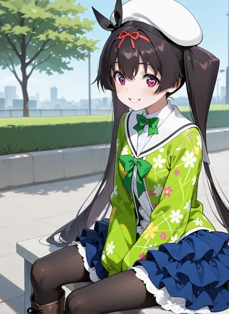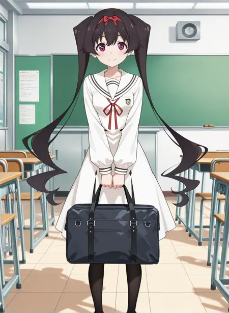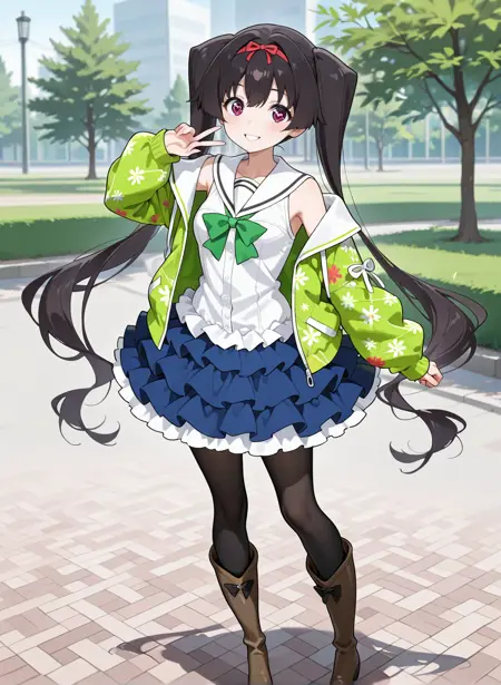 midori_hemo, 极长发, 黑发, 双马尾, 紫色眼睛, 心形瞳孔, 发带