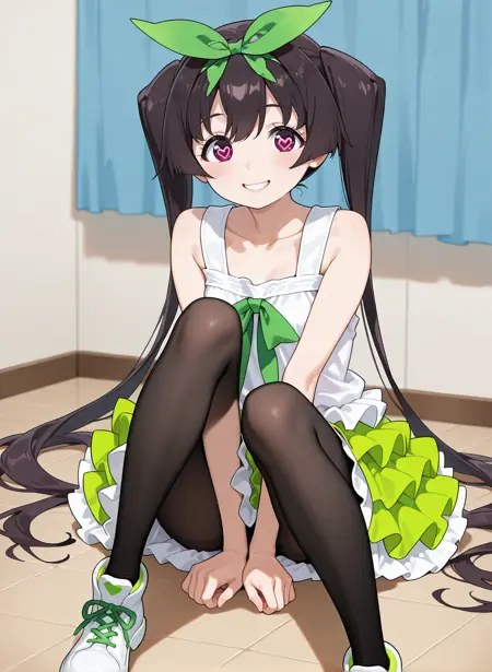 idol_b, 绿色裙子, 荷叶边裙子, 分层裙子, 露肩, 无袖, 白色连衣裙, 绿色发带, 黑色连裤袜, 发带, 黄色蝴蝶结, 绿色丝带, 鞋子, 锁骨