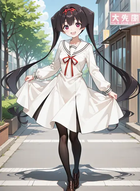 校服, 连衣裙, 水手服连衣裙, 白色连衣裙, 长袖, 白色水手领, 领结, 黑色连裤袜, 鞋子