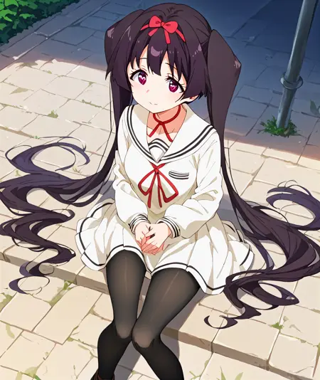 midori_hemo, very long hair, black hair, twintails, purple eyes, heart-shaped pupils, hair ribbon