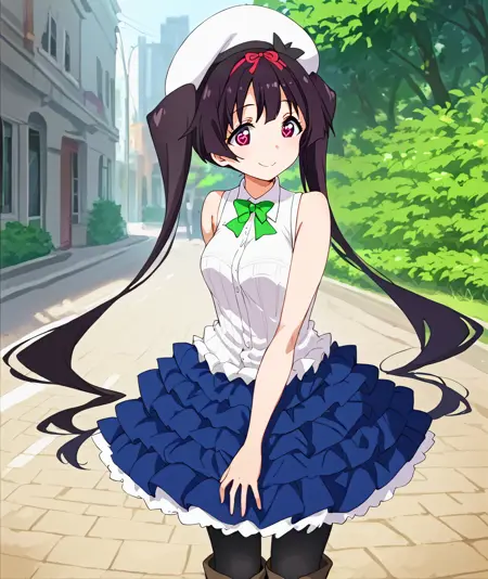 idol_b,green skirt,frilled skirt,layered skirt,bare shoulders,sleeveless,white dress,green hairband,black pantyhose,ribbon,yellow bow,green ribbon,shoes,collarbone
