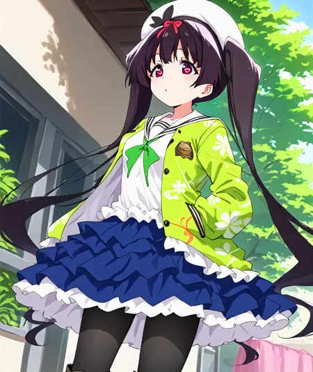 idol_a, 白色帽子, 蓝色裙子, 荷叶边裙子, 分层裙子, 绿色夹克, 长袖夹克, 印花夹克, 花卉印花, 白色水手领, 白色衬衫, 无袖衬衫, 绿色领结, 黑色连裤袜, 过膝靴