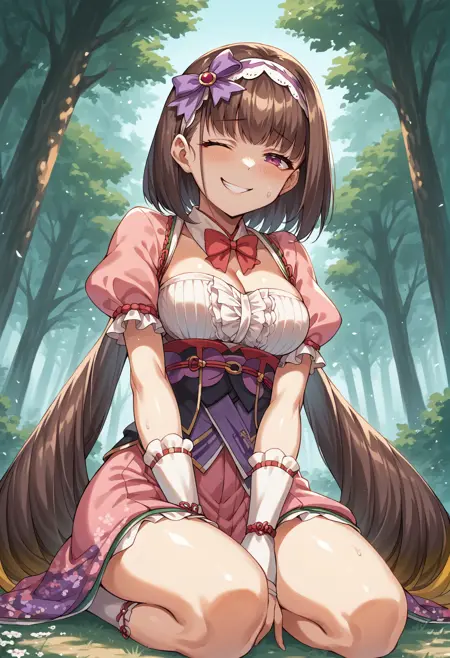 Third: very long hair, multicolored hair, gradient hair, brown hair, blonde hair, purple eyes, low twintails, hairband, ribbon, blouse, japanese clothes, bridal gauntlets, skirt, detached collar, juliet sleeves, puffy sleeves, short sleeves, cleavage, red bowtie