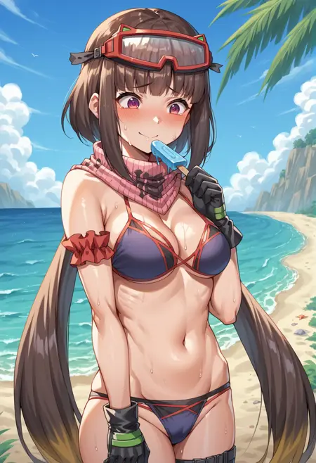 Swimsuit: very long hair, multicolored hair, gradient hair, brown hair, blonde hair, purple eyes, low twintails, scarf, bikini, goggles on head, thigh holster, gloves, jacket