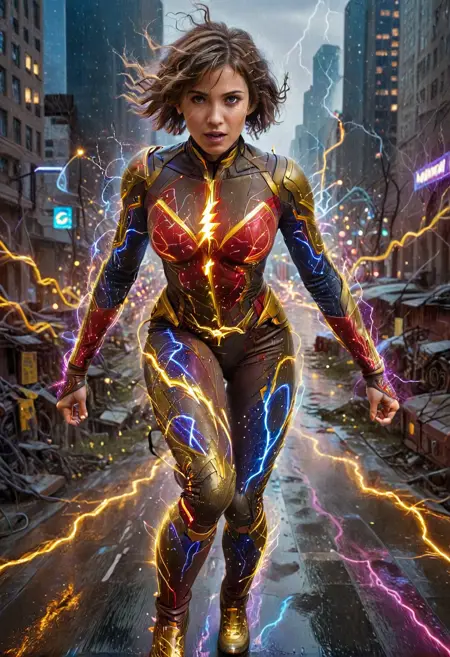 このバージョンを正しく動作させるには、「金色、青、赤、黄、紫の雷の軌跡でできた」という文言を使用し、ご希望の色に変更してください。重みは0.3~1程度で効果的ですが、Ponyでは0.9~2の高い重みが必要です。