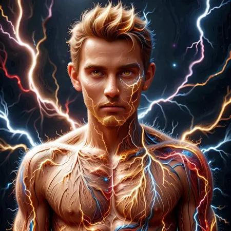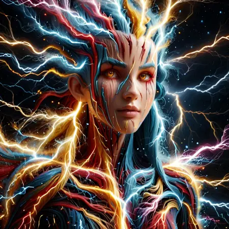 このバージョンを正しく動作させるには、「金色、青、赤、黄、紫の雷の軌跡でできた」という文言を使用し、ご希望の色に変更してください。重みは0.3~1程度で効果的ですが、Ponyでは0.9~2の高い重みが必要です。