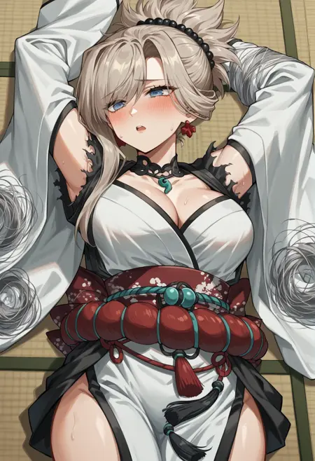 첫 번째 상승: 파란 눈, 긴 머리카락, 회색 머리카락, 한쪽 이마털, 단일 포니테일, 머리장식, 일본 복장, 어깨 없는, 오비, 신부 장갑