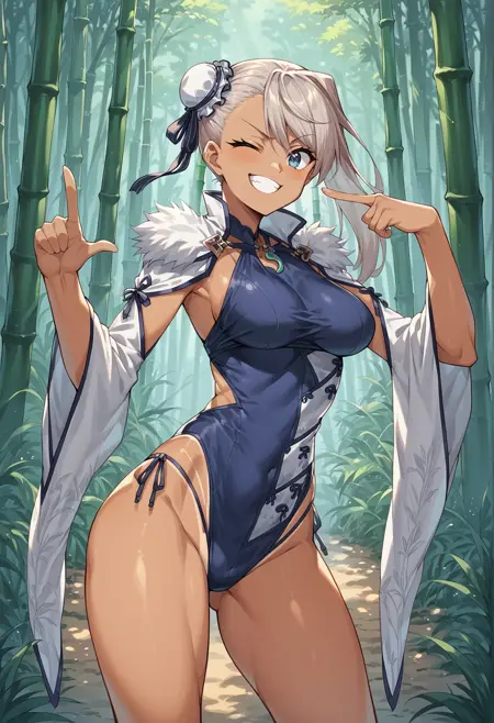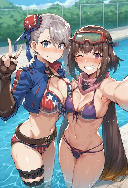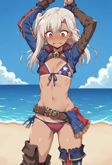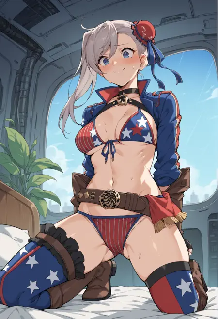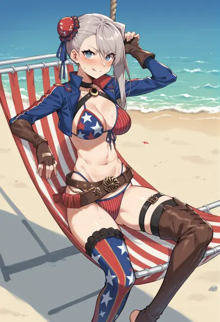 수영복2: 파란 눈, 긴 머리카락, 회색 머리카락, 한쪽 이마털, 단일 머리끈, 머리끈 커버, 빨간 머리끈 커버, 미국 국기 비키니, 짧은 재킷, 긴 소매, 비대칭 장갑, 손가락 없는 장갑, 비대칭 하의, 비대칭 신발, 단일 허벅지 스타킹, 허벅지 부츠, 벨트