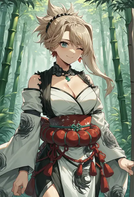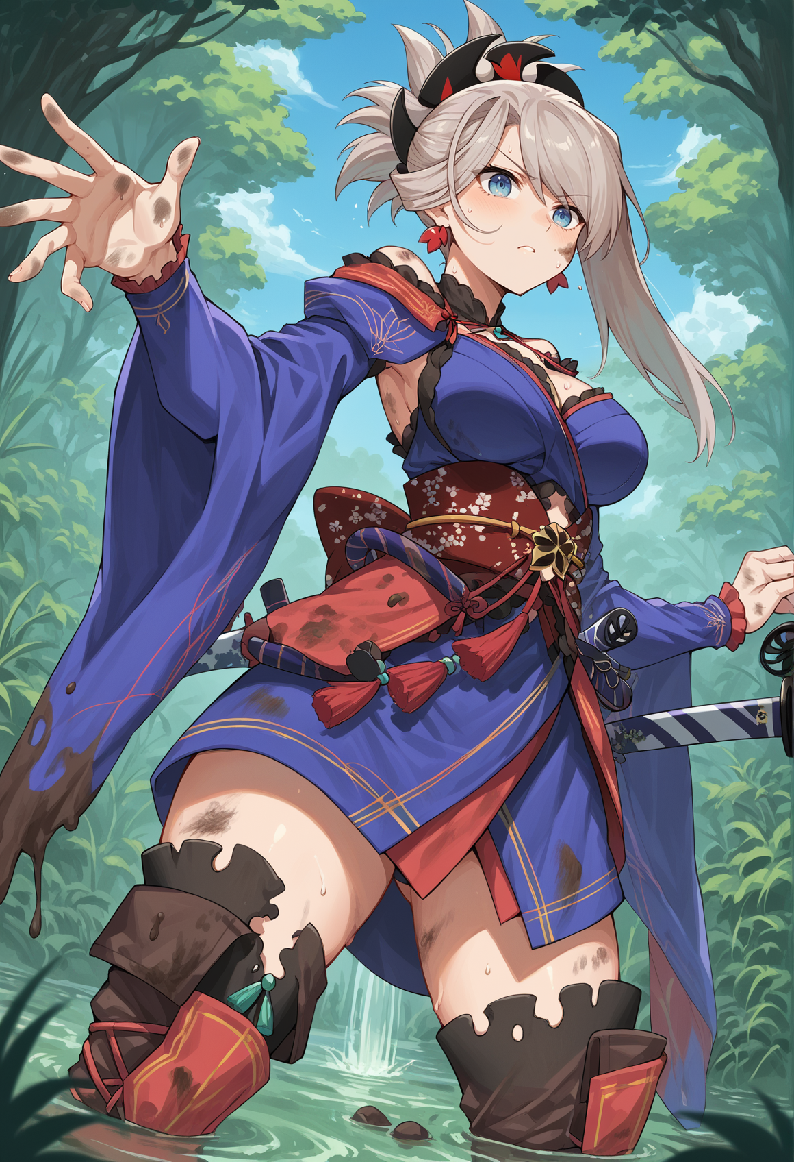 사무라이: 파란 눈, 긴 머리카락, 회색 머리카락, 한쪽 이마털, 포니테일, 스러니치, 일본 복장, 분리된 칼라, 마가타마, 흰색 키모노, 골반 커튼, 분리된 소매, 넓은 소매, 밧줄, 귀걸이, 가슴 노출