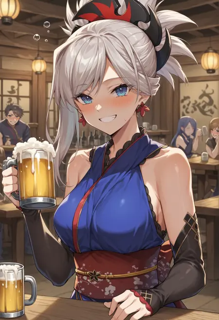 세 번째 상승: 파란 눈, 긴 머리카락, 회색 머리카락, 한쪽 이마털, 단일 포니테일, 머리장식, 귀걸이, 분리된 칼라, 일본 복장, 파란 키모노, 가슴 노출, 분리된 소매, 넓은 소매, 오비, 마가타마