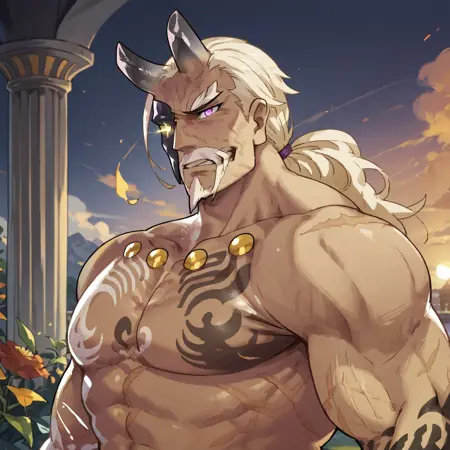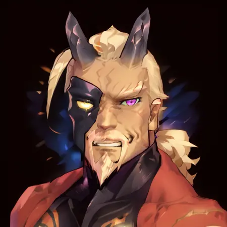 触发词: Kai Yan、金发、角、半脸面具、马尾、发光的眼睛、山羊胡、单人、健壮、疤痕、纹身、白臂、黑臂、装甲腰身、蹄子,