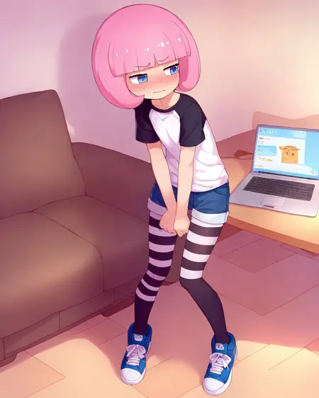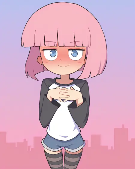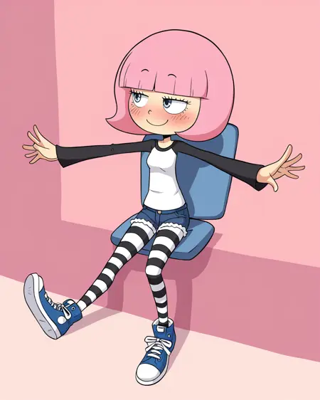 使用 hckrgrl 召唤她,使用 粉色头发,齐耳短发,齐刘海,黑色眼睛 构建她的头部,使用 白色衬衫,黑色衬衫,长袖 召唤她的默认服装。