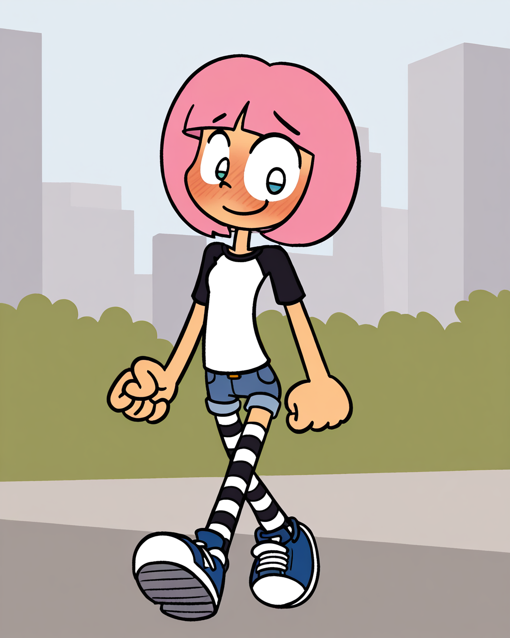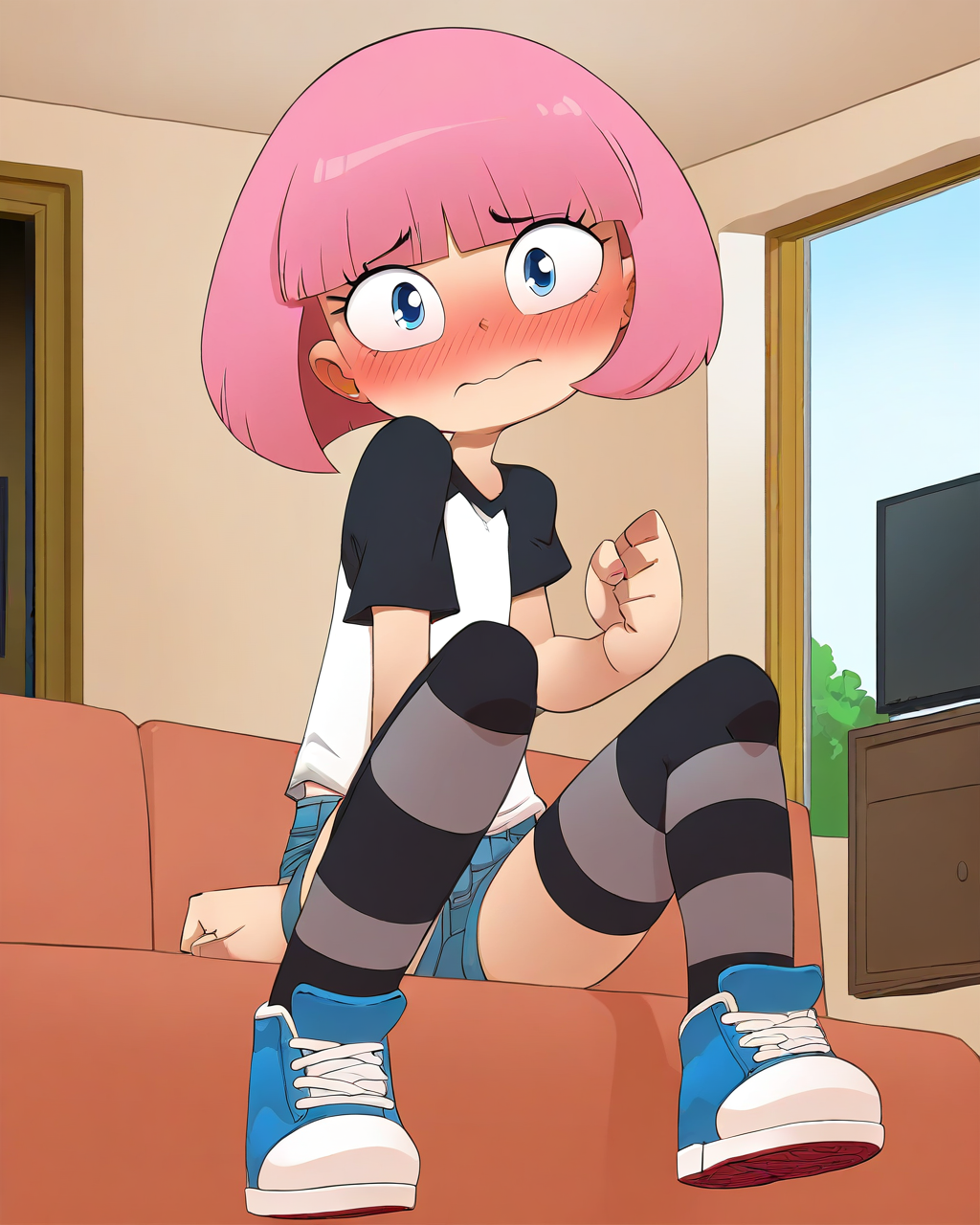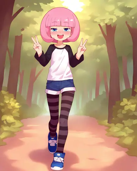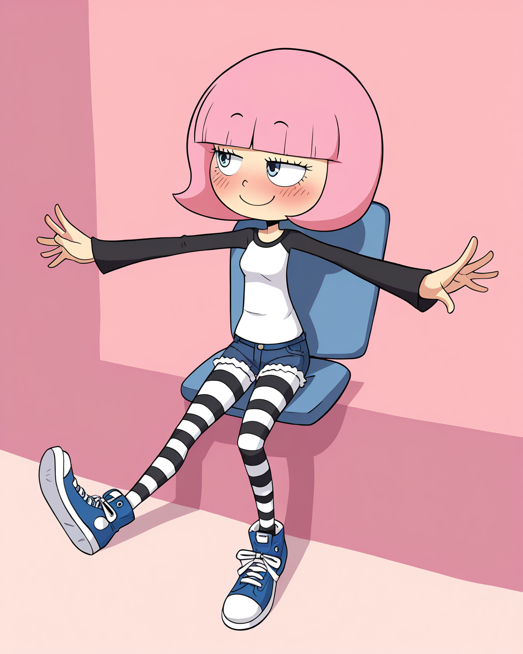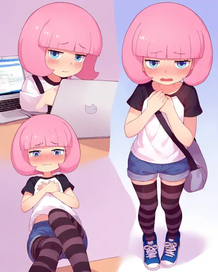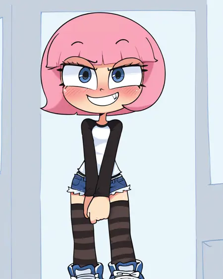 **hckrgrl**을 사용해 그녀를 소환하고, **핑크 머리, 번스컷, 뚜렷한 앞머리, 검은 눈**을 사용해 그녀의 머리를 만들며, **화이트 셔츠, 블랙 셔츠, 긴팔**을 사용해 기본 복장을 소환하세요.