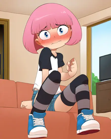 补充标签:黑色衬衫,白色衬衫,罗纹袖,丹宁短裤,条纹袜套,黑色长筒袜,蓝色运动鞋