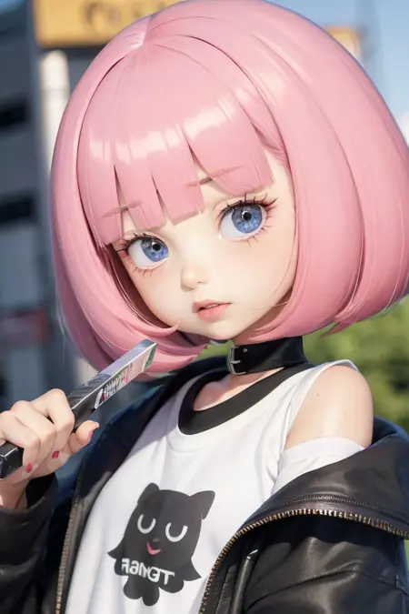 **hckrgrl**을 사용해 그녀를 소환하고, **핑크 머리, 번스컷, 뚜렷한 앞머리, 검은 눈**을 사용해 그녀의 머리를 만들며, **화이트 셔츠, 블랙 셔츠, 긴팔**을 사용해 기본 복장을 소환하세요.