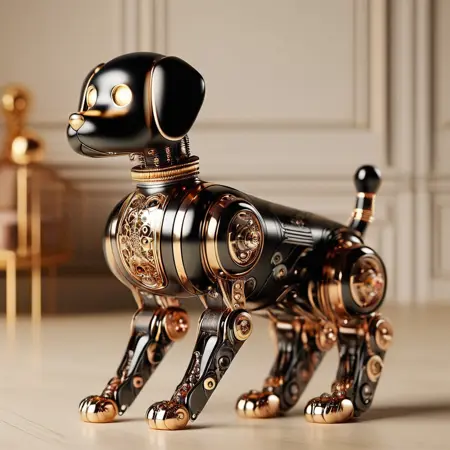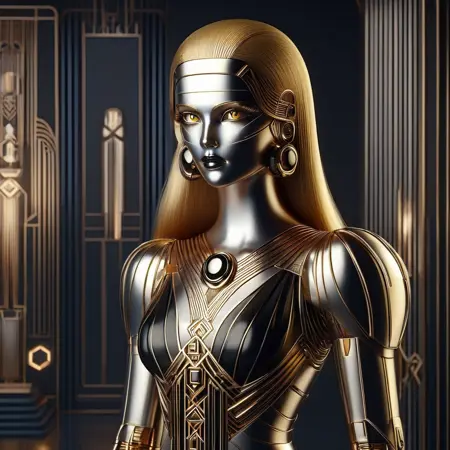 로어링 20년대의 화려한 시대에 상상된 미래지향적 낙관주의의 세계로 들어서세요. 이 테마는 가장 어두운 검은색과 가장 화려한 금색 액센트로 특징지어지며, 기계식 동반자들이 가득합니다.