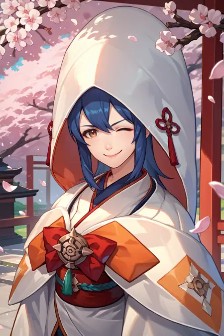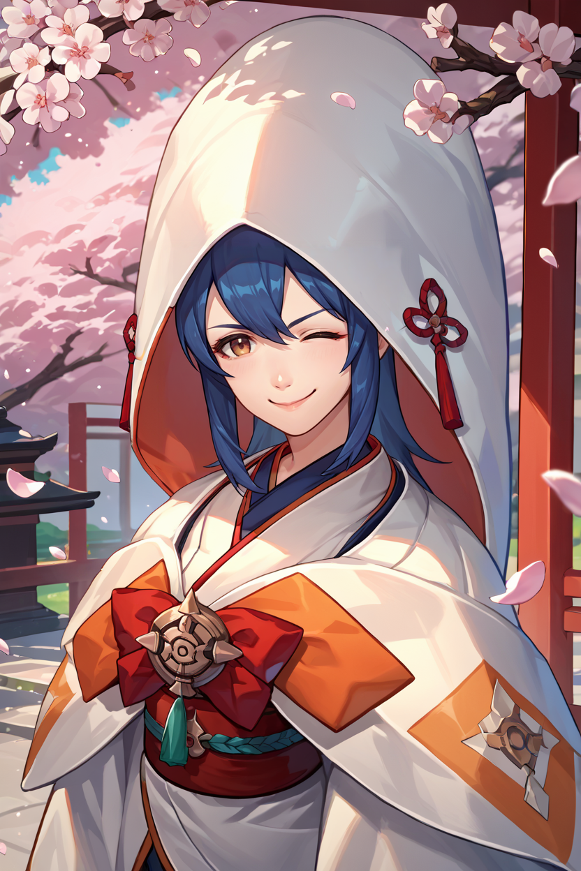 为婚礼版Oboro添加:“feObo, 深蓝色头发, 帽兜, 白色和服, 红色腰带, 长袖”。