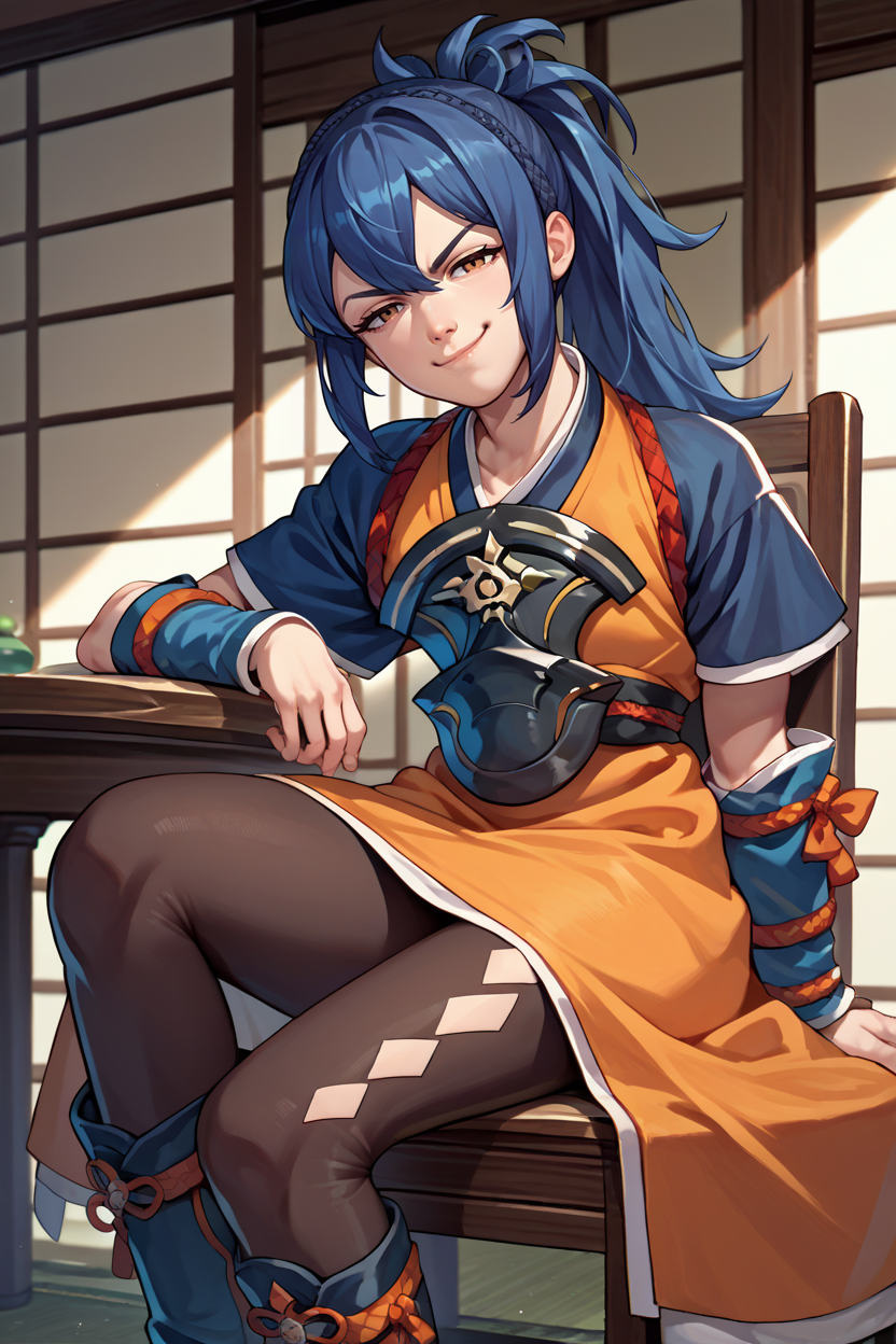 为她的常规外观添加:“feObo, 深蓝色头发, 马尾, 橙色连衣裙, 蓝色袖子, 短袖, 日本铠甲, 图案丝袜”。