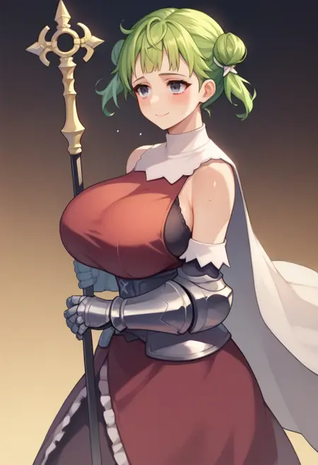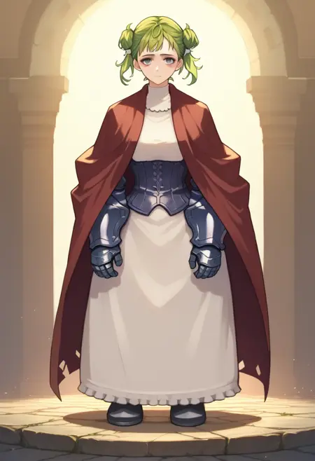 lora:tatiana-10:1.0, tatiana, 神父, ストール, 非常に長いストール, 赤いストール, ドレス, 濃紺のマント, 非常に長いマント, 白いローブ, 白いドレス, 非常に長いドレス, 緑色の髪, 髪の結び目, 黒い靴, アーマー, 大腿アーマー, 灰色の目, ダブルバント, ガンレット, コルセット, (ブーツ:0.9),