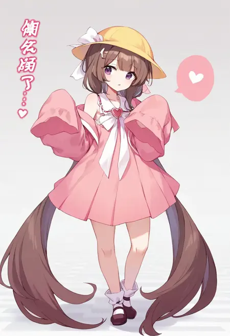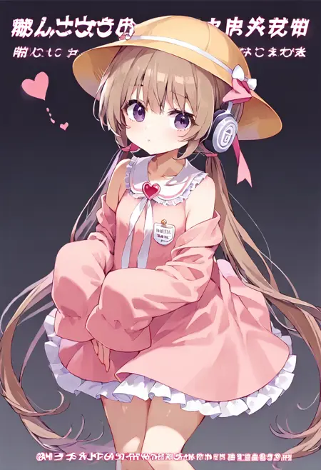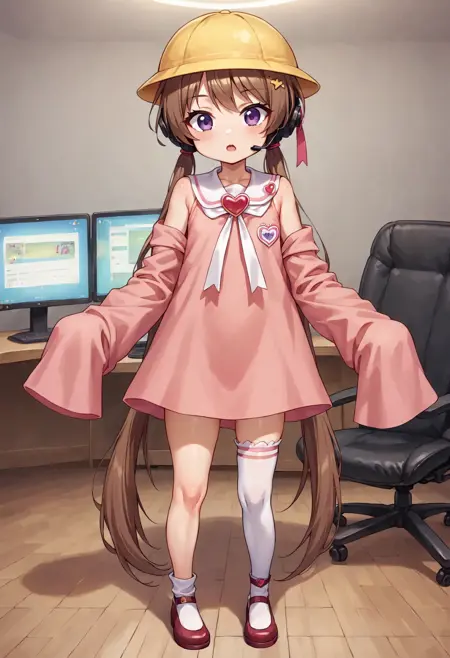 <lora:TsukiyomiAi_MMD_Pony_V1:0.8> 月读艾,紫色眼睛,棕色头发,非常长的头发,低双马尾,刘海,粉色发带,耳机,头戴式麦克风,学校帽,黄色帽子,
