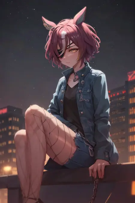 - バンダナ、黒いチョーカー、ショルダーレス、タンクトップ、紫のシャツ、黒いジャケット、開いたジャケット、ショートショーツ、デニムショーツ、カットオフ、フィンガーネットタイツ
