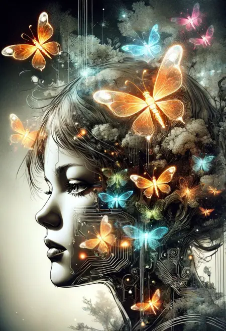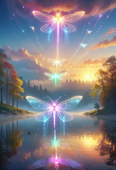 This model is a World Morph that attempts to make anything out of cyberpunk fireflies, which turn out to be a mixture of fireflies and circuits. It may also add fireflies flying around. The activation word is "cyberflies", but it can be used in different combinations to achieve slightly different effect, in particular, "made of cyberflies", "entirely made of cyberflies", "in style of cyberflies", or just "cyberflies [your object]". Adding "transparent" or "translucent" to the object may also add a volumetric effect.