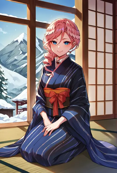 lui-newyr, vertical striped kimono, blue kimono, black kimono, drill ponytail, side ponytail, hair over shoulder