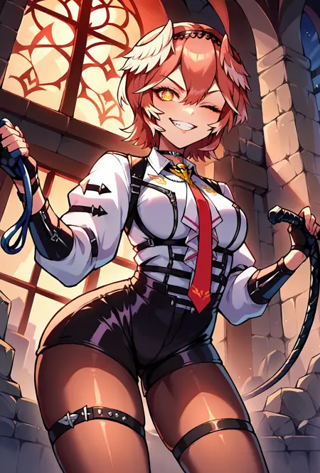 lui-def, red necktie, jacket over shoulder, fingerless gloves, thigh strap, strappy heels