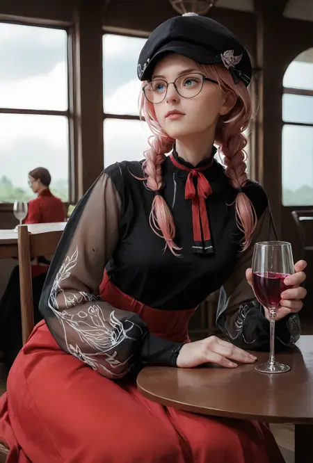 glasses, black-rimmed glasses, flat cap, low twin braids