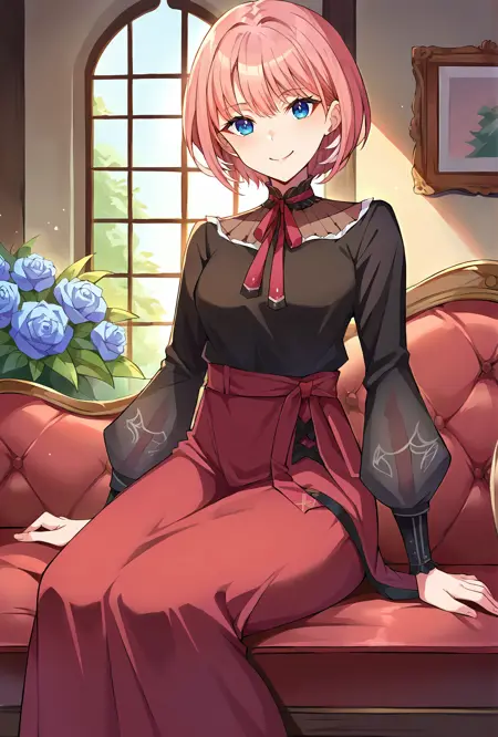 lui-3rd, black shirt, neck ribbon, frilled shirt collar, long skirt, red skirt