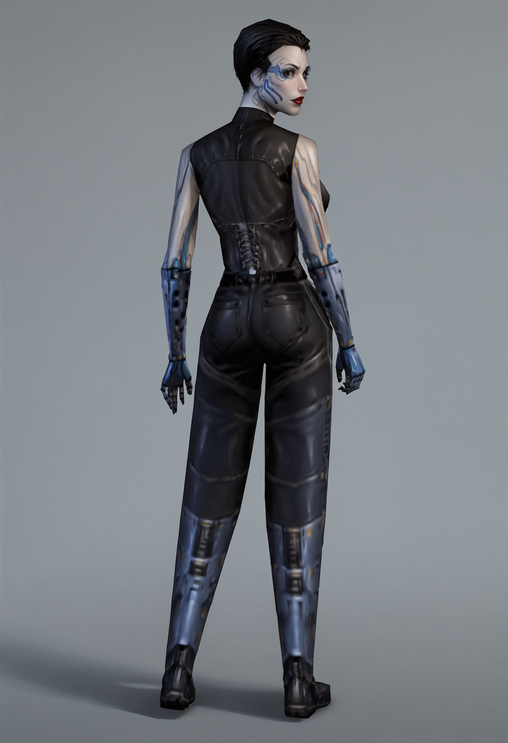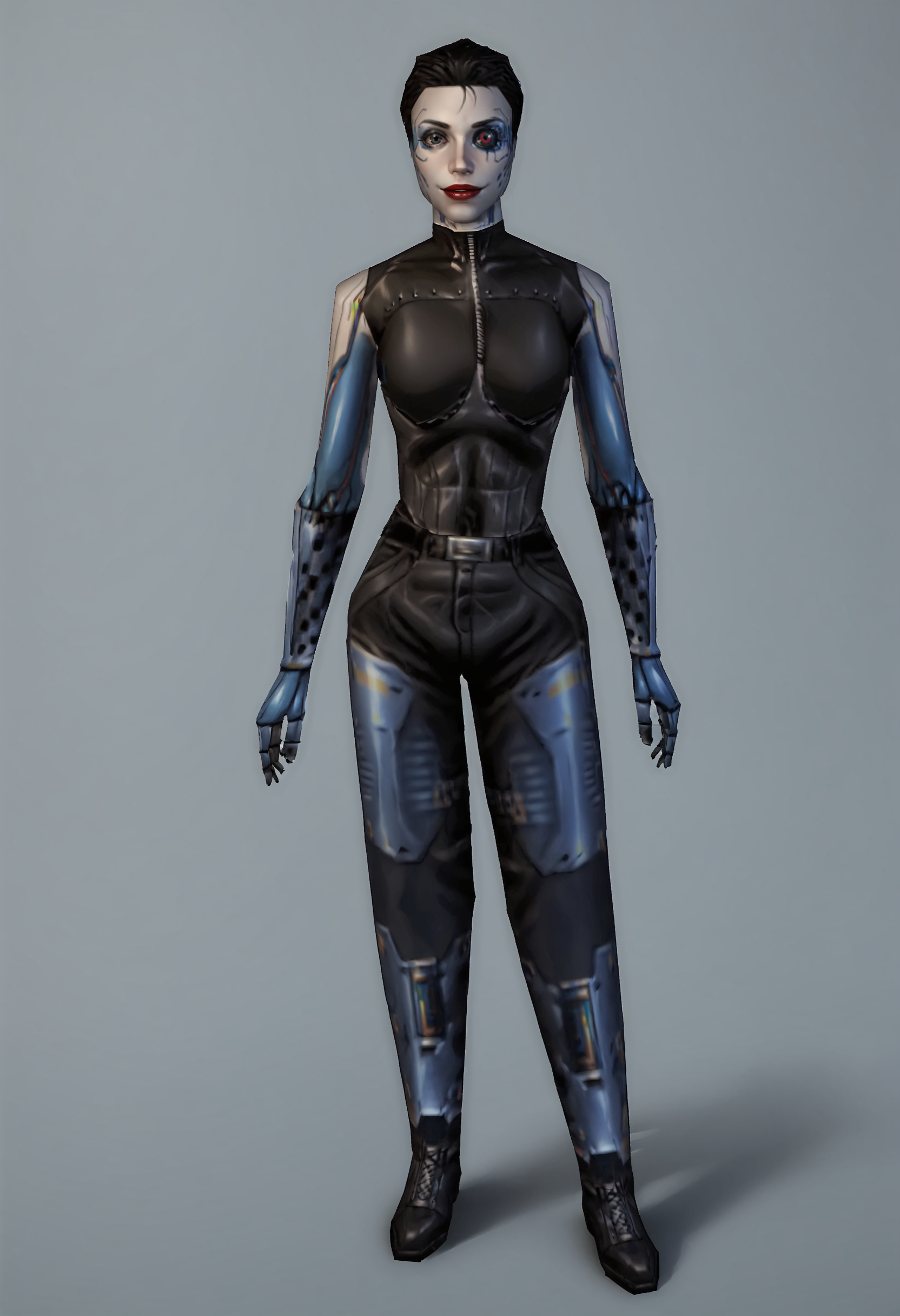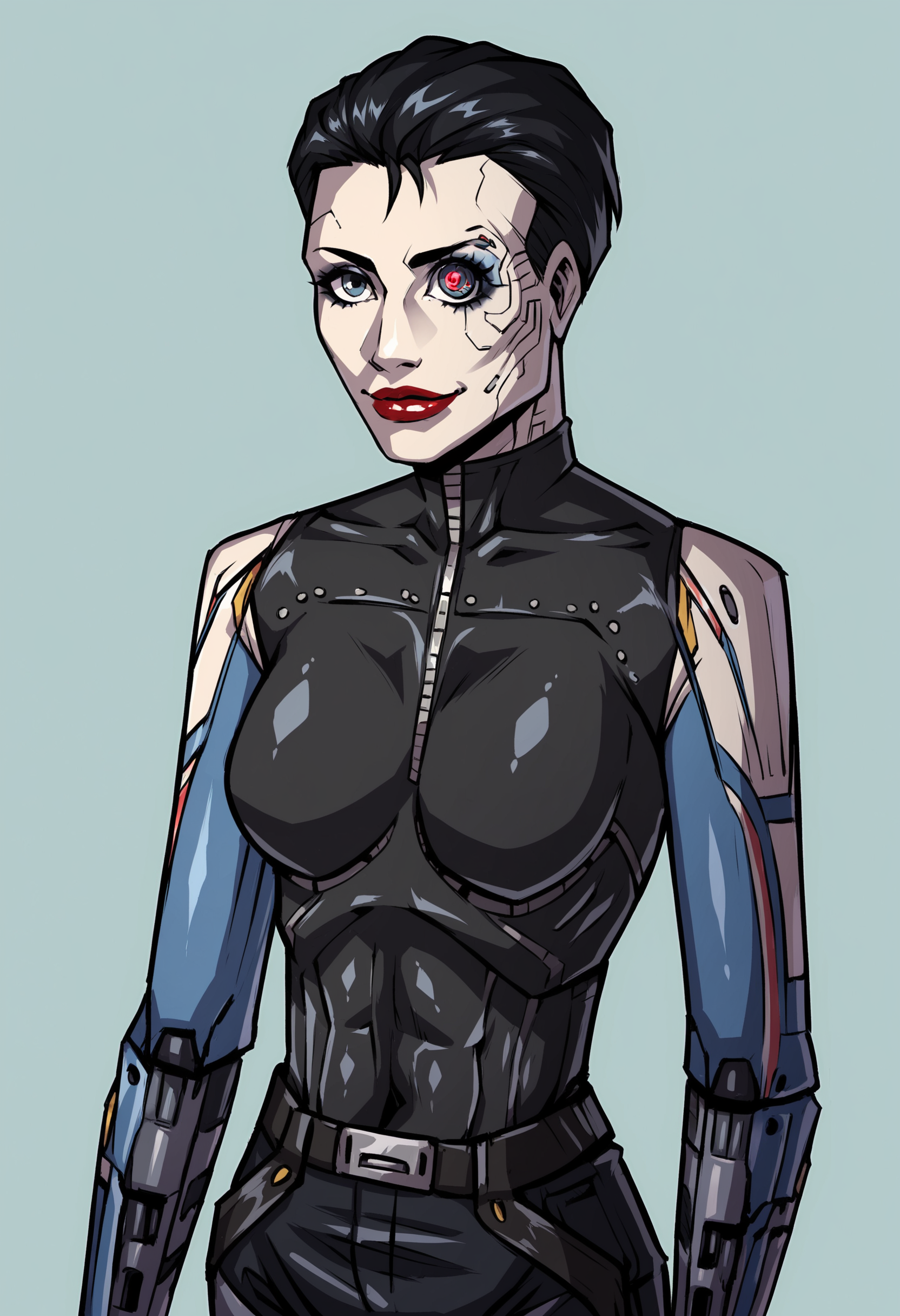 1girl, breasts, cyborg, short hair, black hair, robot joints, mechanical parts, mechanical arms, red lips, makeup, bodysuit, pants, boots