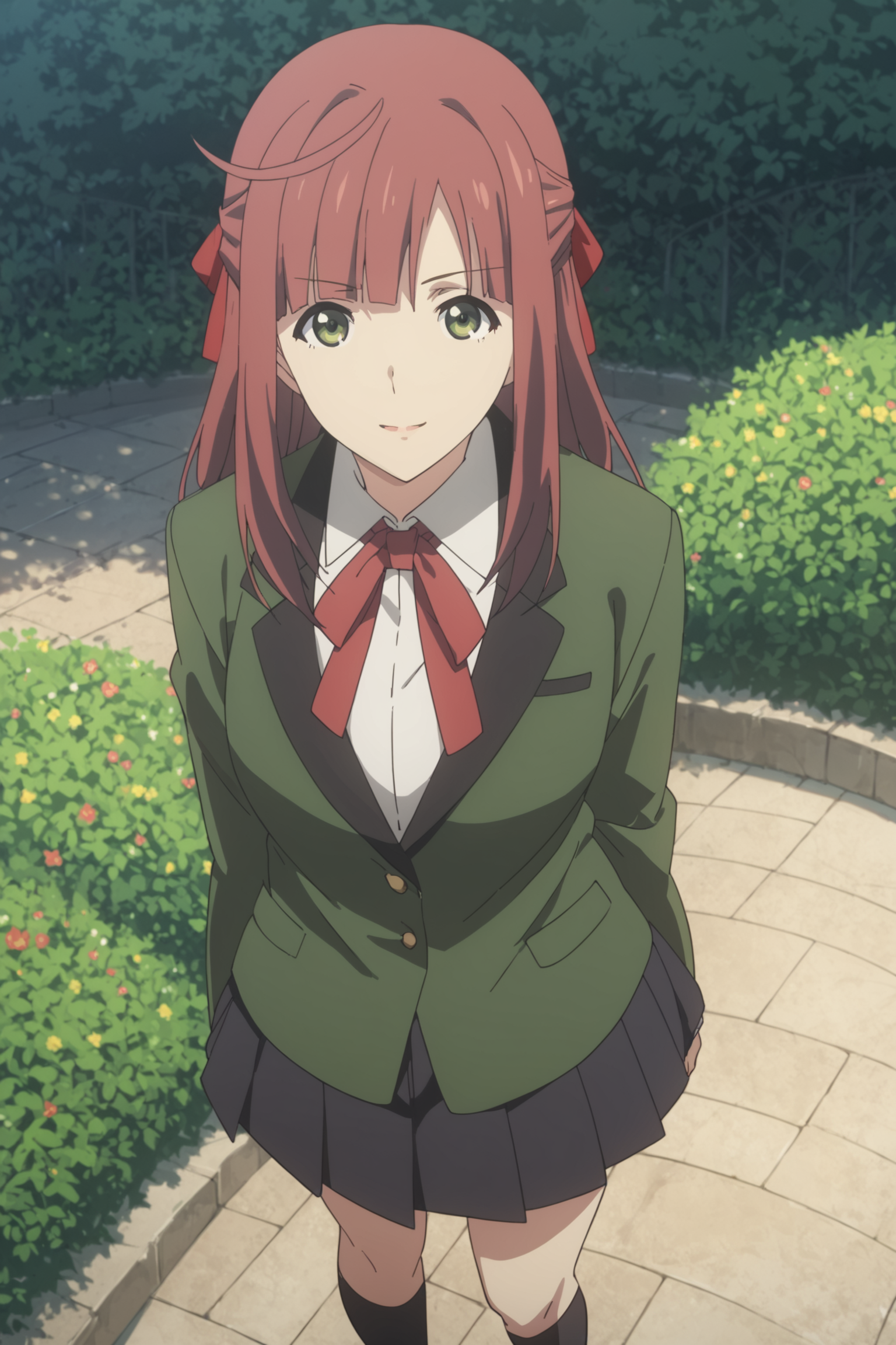 ほむらすずこ、長い髪、赤髪、緑の目、髪リボン、学ラン、赤いボウタイ、白いシャツ、ジャケット、緑のジャケット、黒いスカート、プリーツスカート、黒い膝丈靴下、ローファー